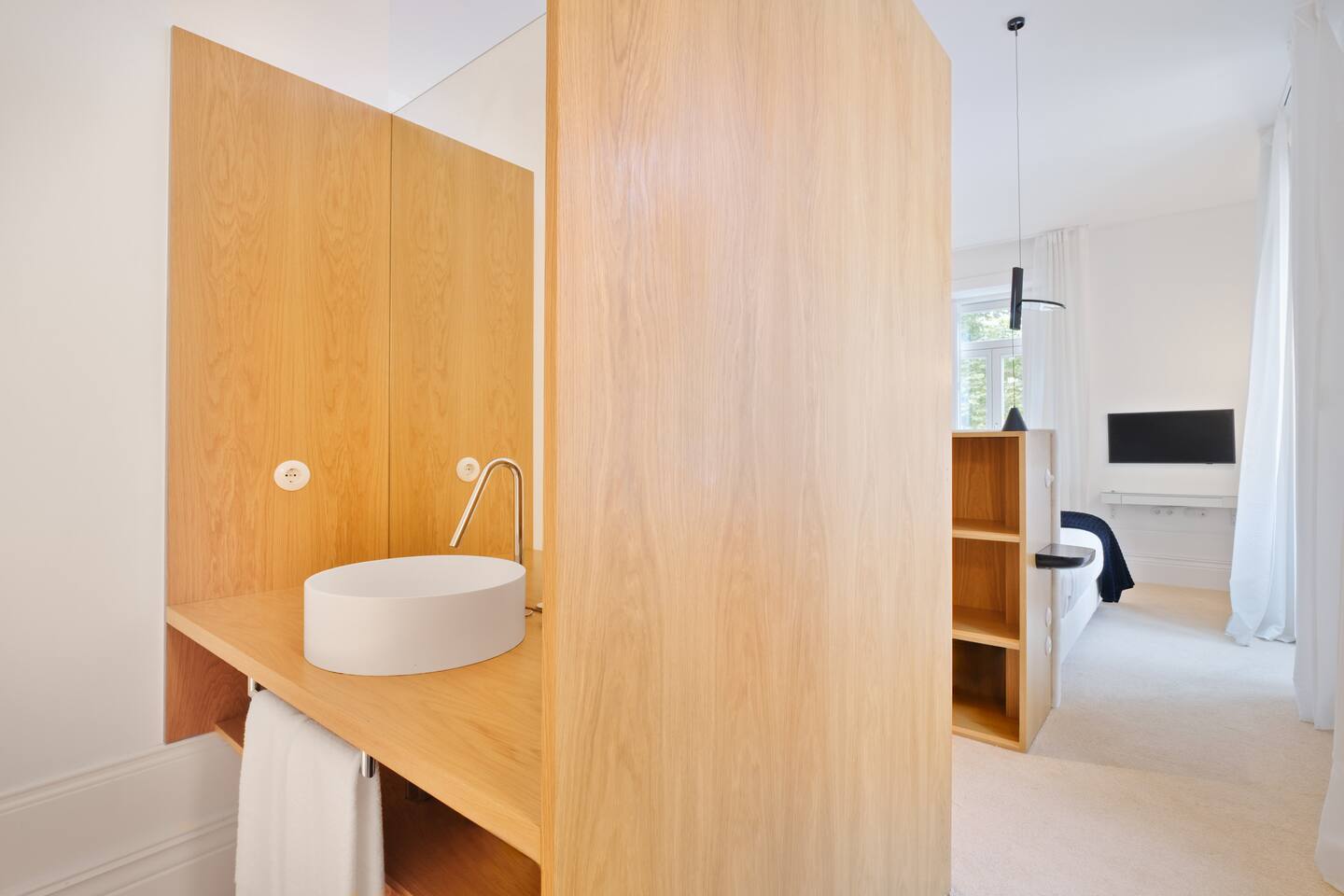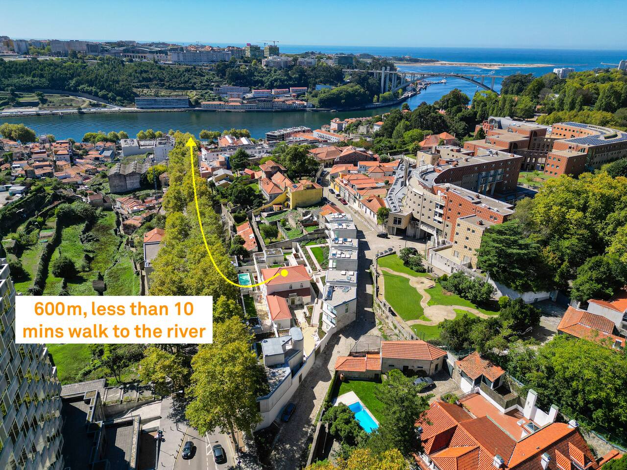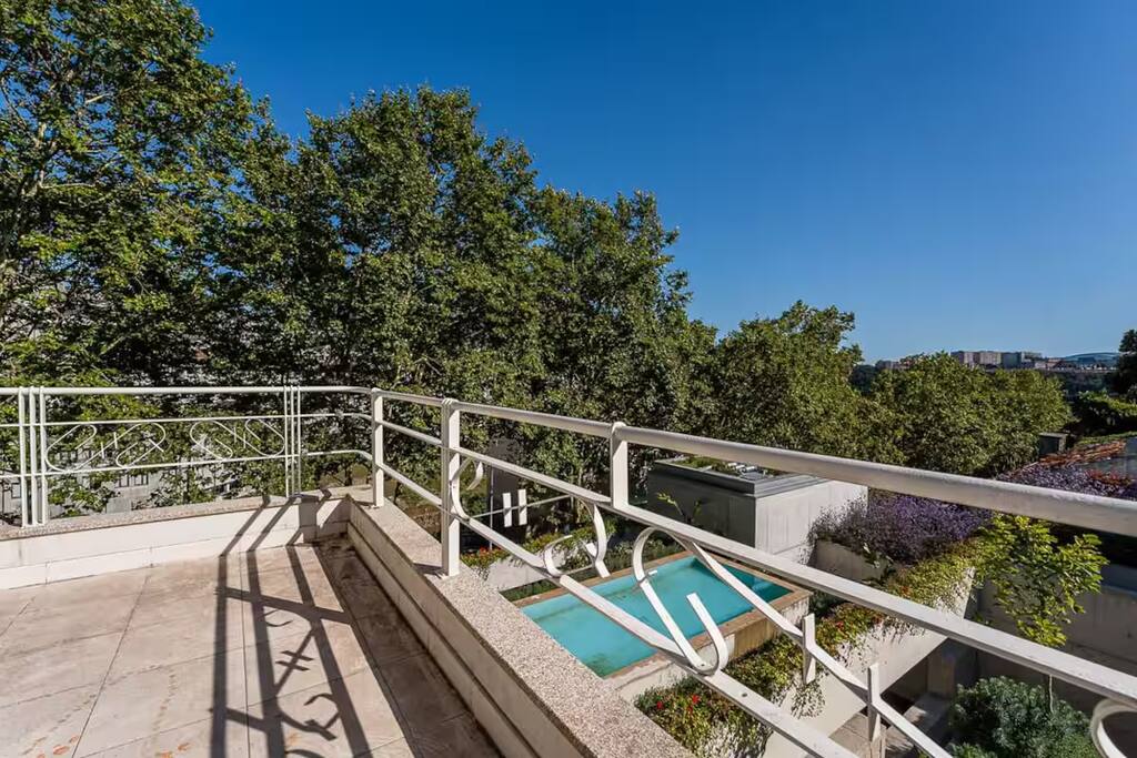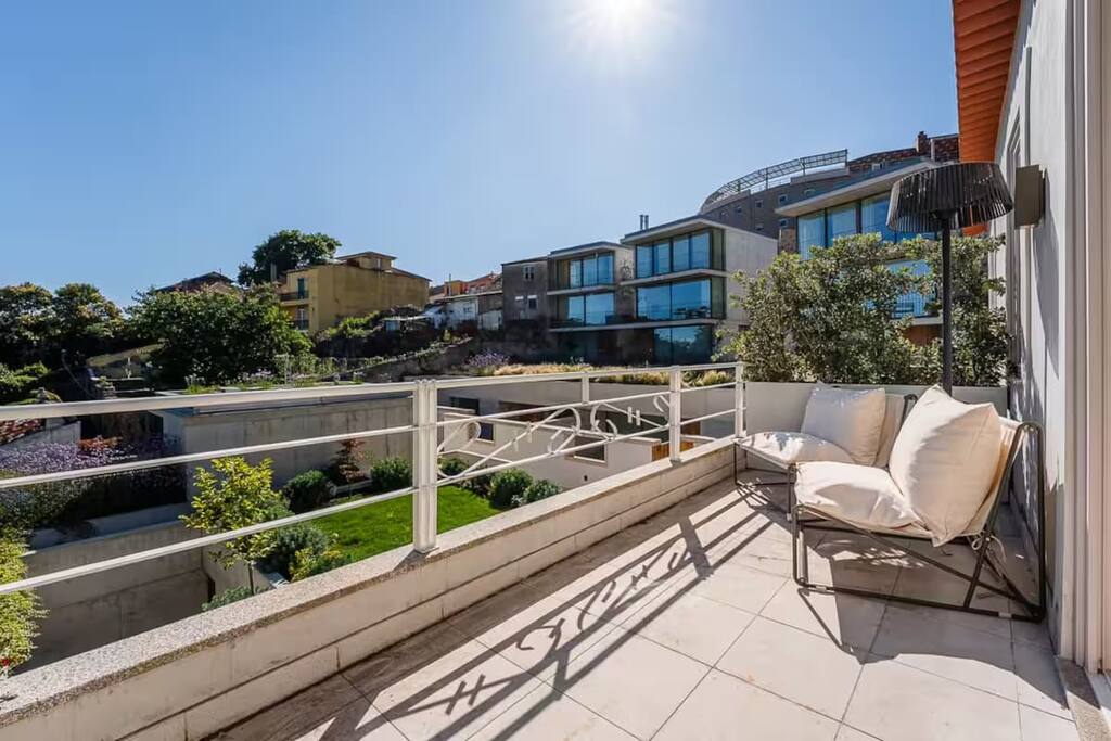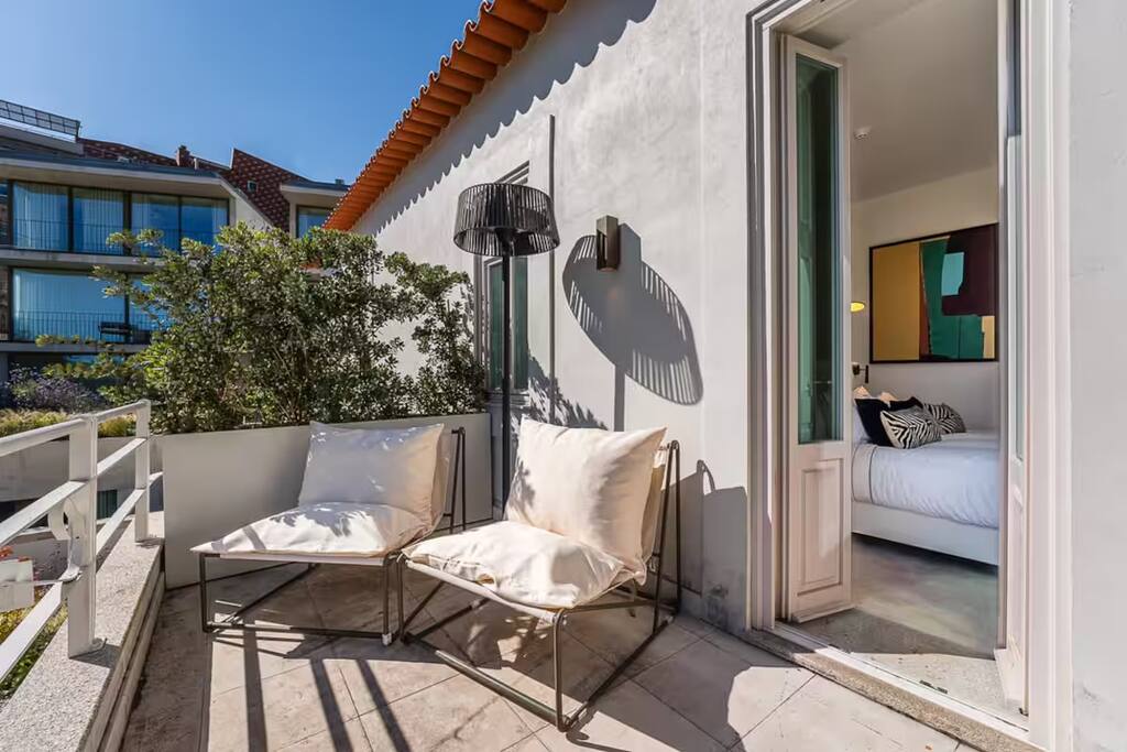 The property combines privacy with gentle community: perfect for those seeking both focus and connection during their Porto stay. - 7 private rooms, each with its own bathroom and thoughtful design details - Pool, garden, and sunny terraces for relaxing afternoons - Shared dining and lounge areas for meals, work, or conversation - Fast Wi-Fi, climate control, and cozy interiors for year-round comfort You can stay in a single room, book several rooms for friends, or reserve the entire guesthouse for up to 14 adults for a private group getaway. Every corner is designed for slow mornings, easy evenings, and a little inspiration along the way. On the upper floor, this spacious room includes a large terrace overlooking the pool and riverside. Ideal for quiet mornings, sunset drinks, and soaking in the views.