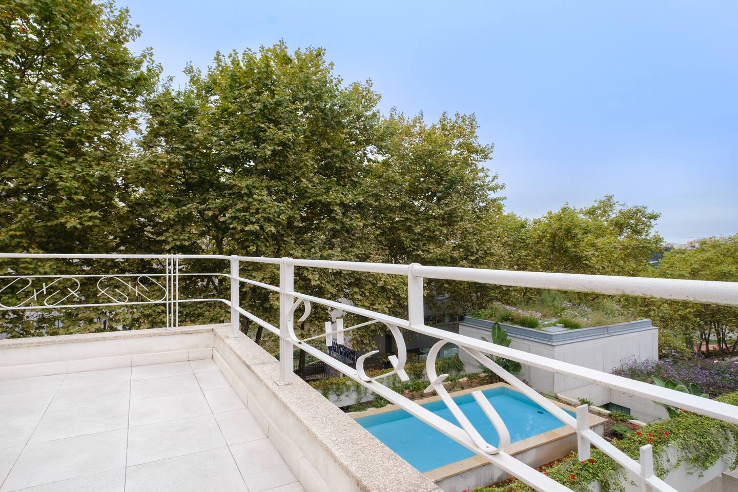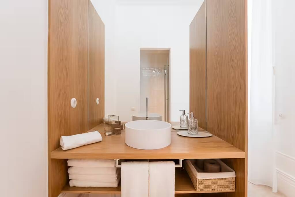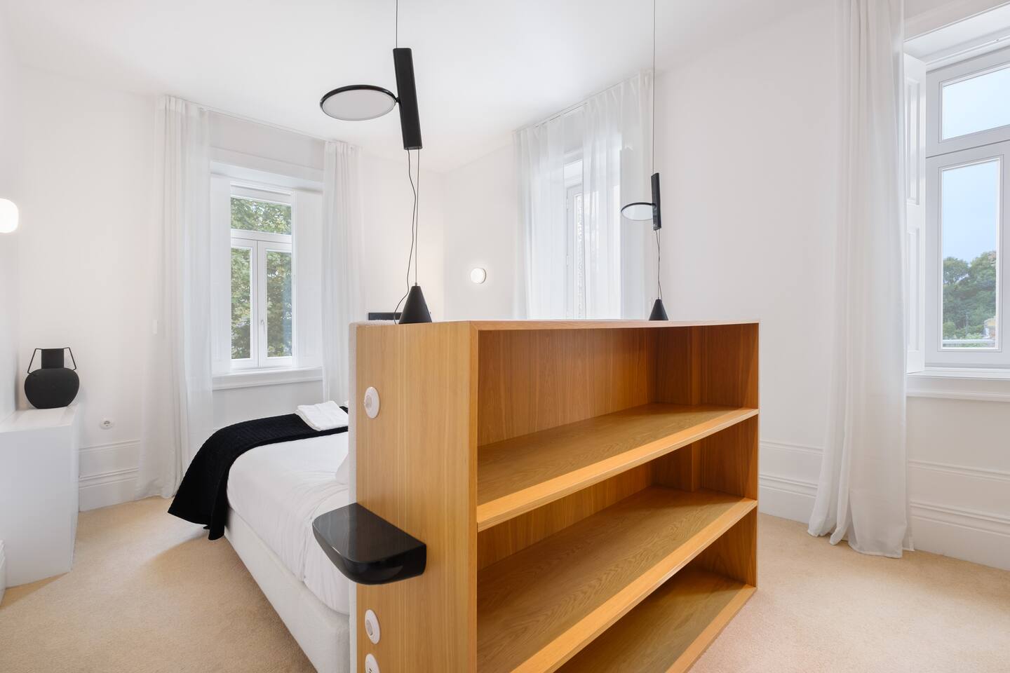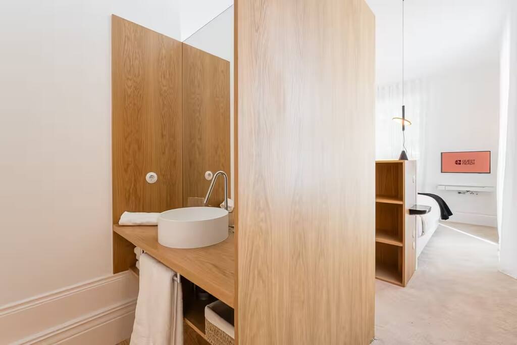 The property combines privacy with gentle community: perfect for those seeking both focus and connection during their Porto stay. - 7 private rooms, each with its own bathroom and thoughtful design details - Pool, garden, and sunny terraces for relaxing afternoons - Shared dining and lounge areas for meals, work, or conversation - Fast Wi-Fi, climate control, and cozy interiors for year-round comfort You can stay in a single room, book several rooms for friends, or reserve the entire guesthouse for up to 14 adults for a private group getaway. Every corner is designed for slow mornings, easy evenings, and a little inspiration along the way. On the upper floor, this spacious room includes a large terrace overlooking the pool and riverside. Ideal for quiet mornings, sunset drinks, and soaking in the views.