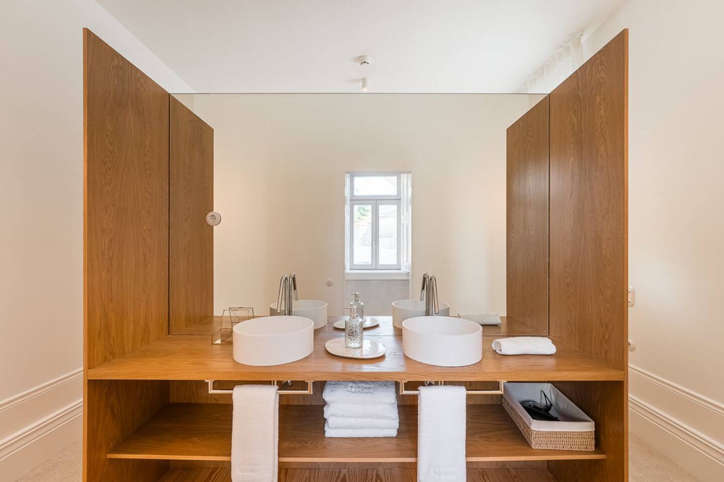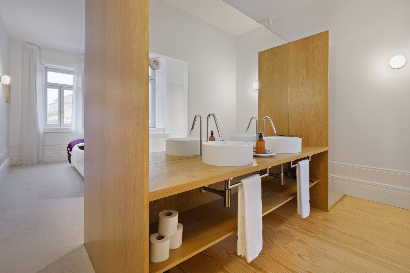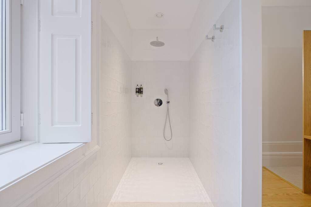 The property combines privacy with gentle community: perfect for those seeking both focus and connection during their Porto stay. - 7 private rooms, each with its own bathroom and thoughtful design details - Pool, garden, and sunny terraces for relaxing afternoons - Shared dining and lounge areas for meals, work, or conversation - Fast Wi-Fi, climate control, and cozy interiors for year-round comfort You can stay in a single room, book several rooms for friends, or reserve the entire guesthouse for up to 14 adults for a private group getaway. Every corner is designed for slow mornings, easy evenings, and a little inspiration along the way. On the upper floor, this spacious room includes a large terrace overlooking the pool and riverside. Ideal for quiet mornings, sunset drinks, and soaking in the views.