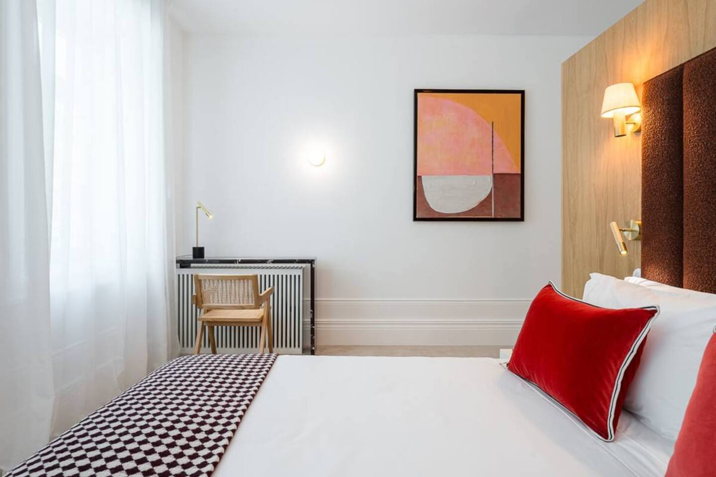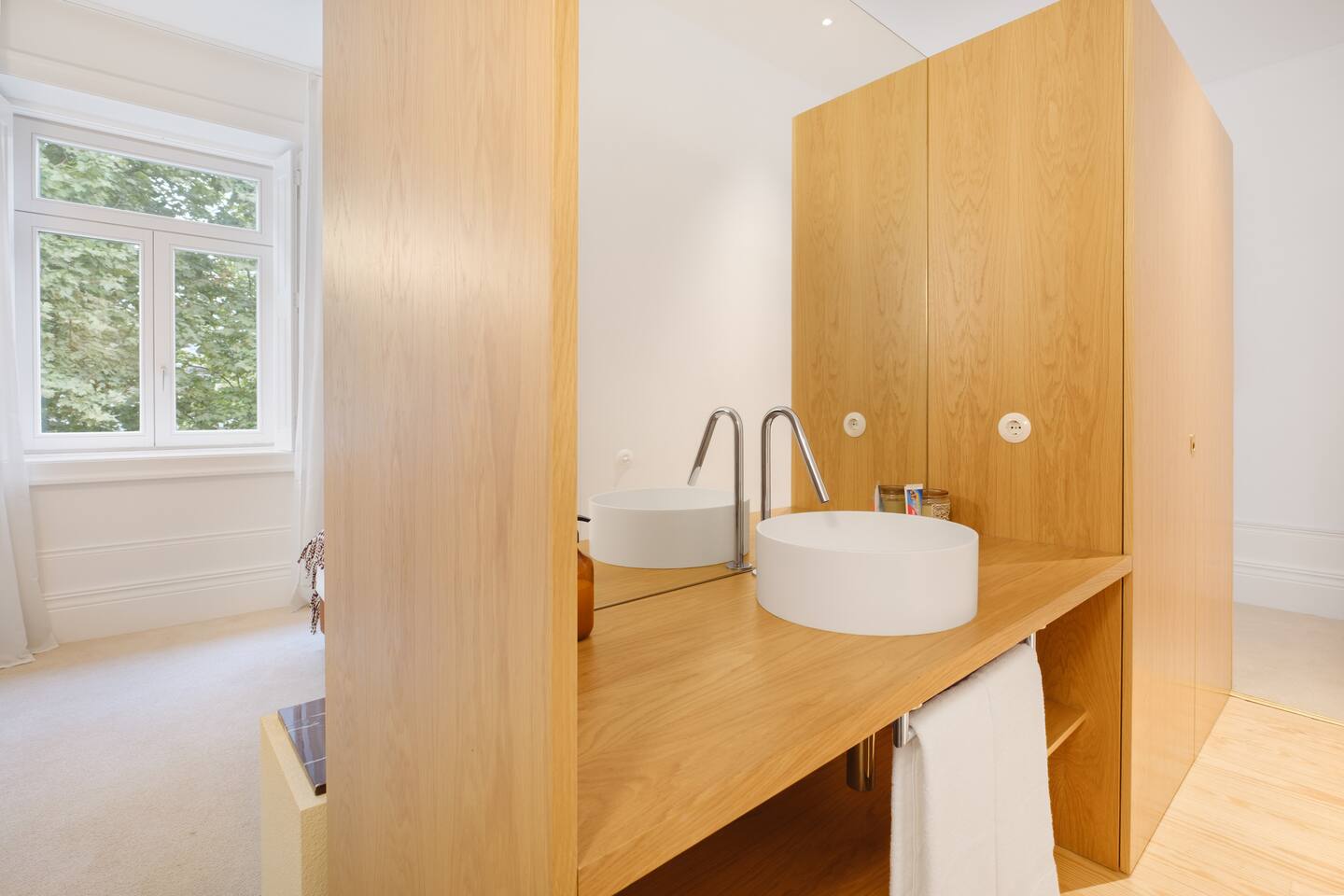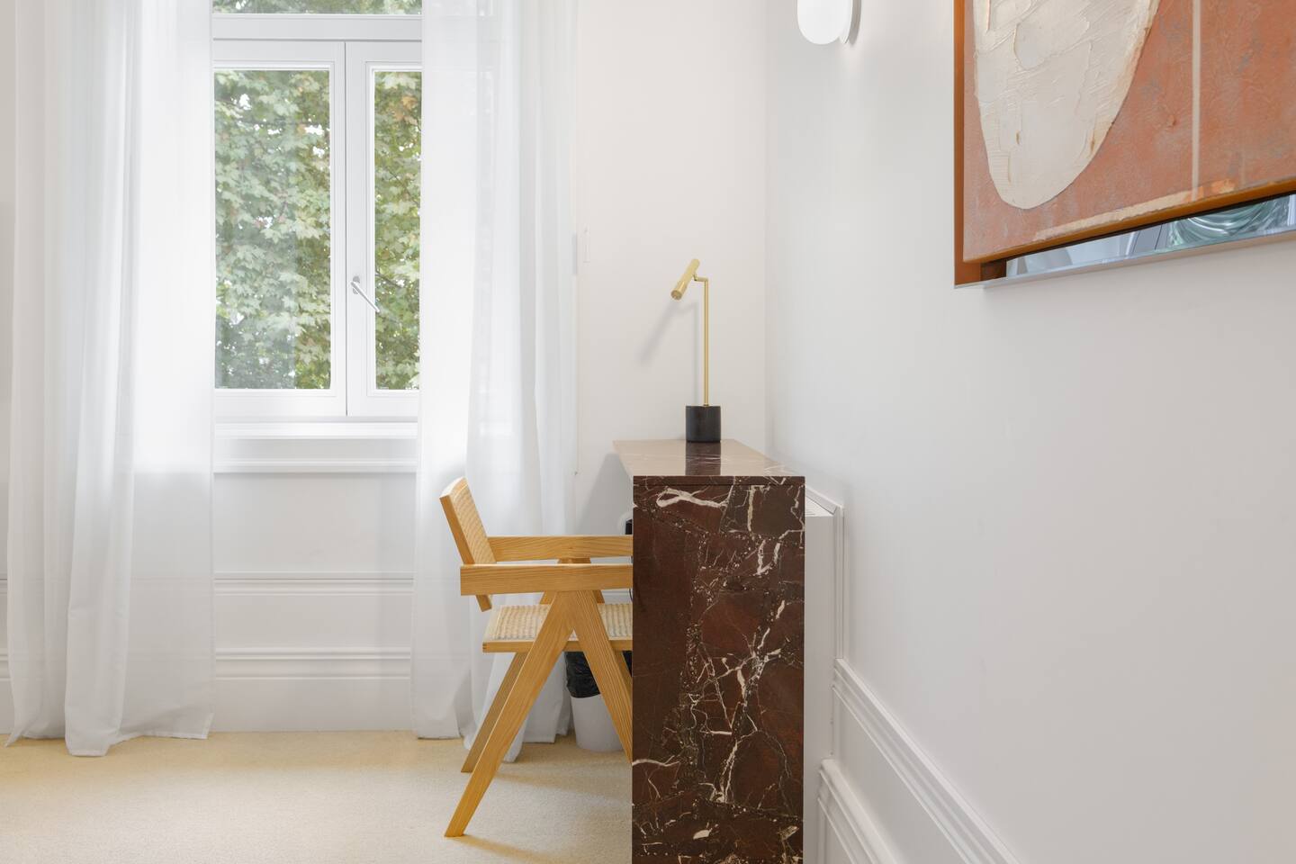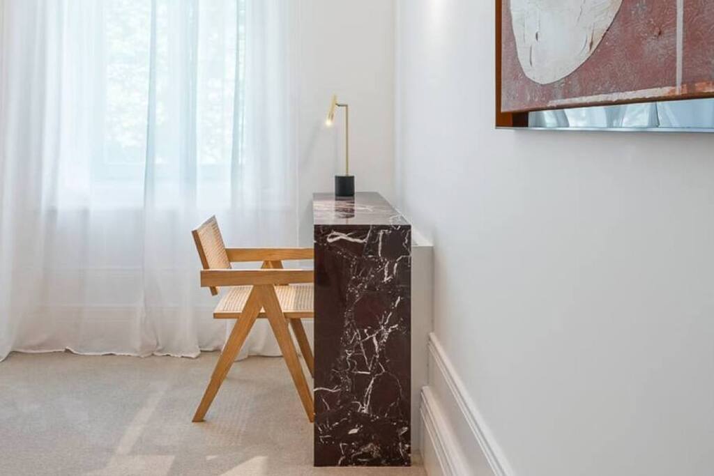The property blends privacy with a gentle sense of community—perfect for those seeking both calm and connection. - 7 private rooms, each with its own bathroom and thoughtful design details - Pool, garden, and sunny terraces for relaxing afternoons - Shared dining spaces open during the day for relaxed meals or quiet work. - Reliable Wi-Fi and climate control to keep you comfortable all year. You can stay in a single room, book several rooms for friends, or reserve the entire guesthouse for up to 14 adults for a private group getaway. The room located on the upper floor, this bright room features high ceilings, a marble writing surface, and city views.